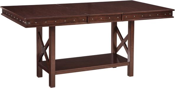 Seat up to 8 with this Collenburg counter-height dining table with a separate drop-in leaf. Surprising nailhead trimming, a convenient table base with braced legs, and a fixed shelf for handy dining organization and storage make this table a standout.